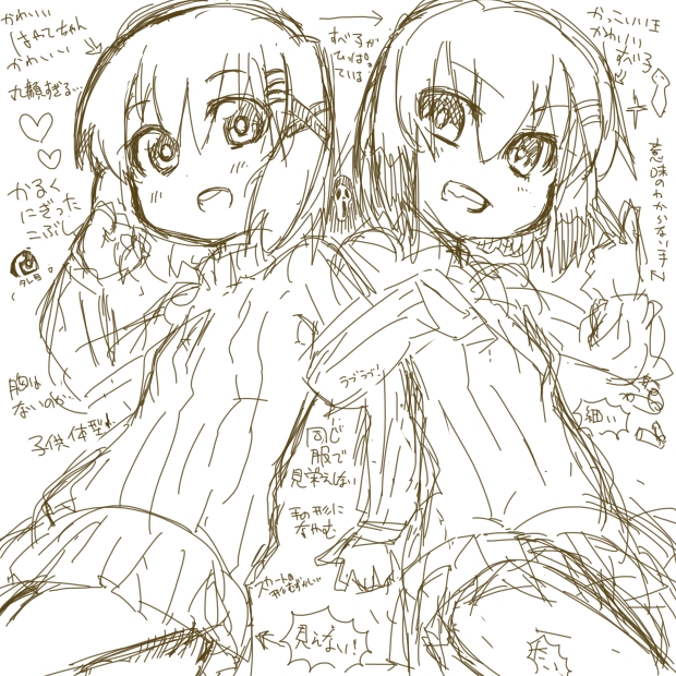 無謀で斬新な企画をはぐれとしてみたけど無理だった 絵チャットには勝てなかったよ… 普通に1時間だけど絵チャして描いたはやてちゃん貼る でかい 大天使降臨 レスる > 「ふとい」「みえない」…わかってる喃くちびる。 まぁ見せないよね。 あと最近ロリ体型がんばって描いてるけどウエストもあまりくびれさせちゃだめなんだなー 大変だなロリ > すべ子の手は一番仲良しっていみで人差し指をたててるっていうのを表現したかったのだ ごめんはぐれ 俺が描いた絵だといみわからないポーズになったなって思っただけなの > なにこれかわいい!!! それはさておき、真ん中にいるスクリーム状のものはやっぱりシャマルさんの亡霊なのでしょうか。 ヤダ…アタイこんなの描いた覚えない…(寝ぼけてたから たぶん本編に出番のないシャマルの亡霊だとおもいます 表紙の案をはぐれがかんがえてくれたのでざっと下書きした