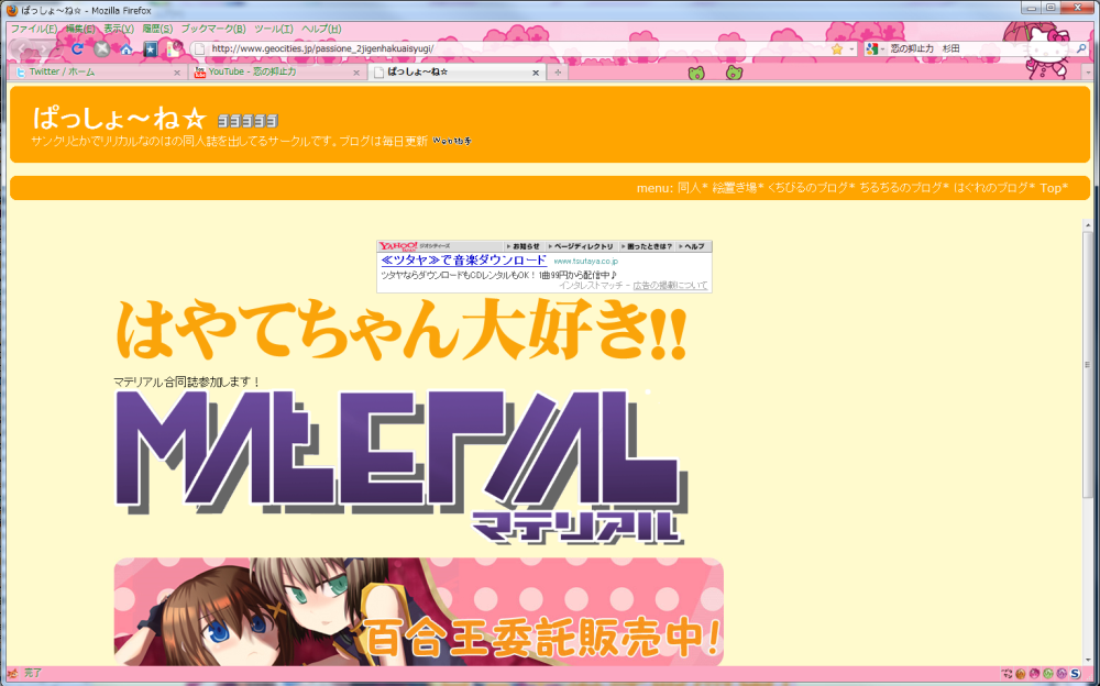 帰ってくるのが0時過ぎちゃうんです。 でも寝起きなせいか何書けばいいかまったく浮かばないの というかさ、文章書くの苦手っていいながらウチのブログのなかで 俺が一番ダラダラと文章かいてるよね はぐれのブログなんてツイッターかよ!ってツッコミを入れたくなるよね。 まぁ性格によりけりなんだろうなぁ… わたしはダラダラと無駄なことを書くのが好きなんですよ > やばい! 参加メンツ見てテンションあがってきた!! あとあれだね。本当に「どこぞの般若やないんやから」になってておもしろかった! ほんとに、意味が分かりません、死んでください。 参加メンツすごいよねー!ほんとウチのサークルは浮きまくってる気がするよ! 特設ページみたなのはファンが 「え・・・なにこのぱっしょ~ね☆ってサークル…知らない…」ってなってるとおもうと ドキンがムネムネするよね。 それにしても本のあとがきまで読んでる通な人からの拍手だわ!なんだかうれしいわー! ほんとはそこの部分、サイトにあげるときに修正しようとおもったけどあとがきで書いてるしな… っておもってビクビクしながらそのままあげました。 > 30000絵ありがとうございます。フェイトスキーの僕もこのサイトでシコシコweb拍手をするうちにはやてちゃんかわいいと思うようになりました。合同誌も楽しみにしてますのでがんばってください。 ありがとうございます!合同誌がんばります! はやてちゃんかわいいが脳に刷り込まれたんですね!狙い通りです! あと一時期はやてちゃんかわいいでイメ検すると一番上におでんカレーがでるようになってたけど いつのまにか跡形もなく消えてた。 ウチのサイトの画像はなぜかまじぽかのゆうまがでるようになってた。